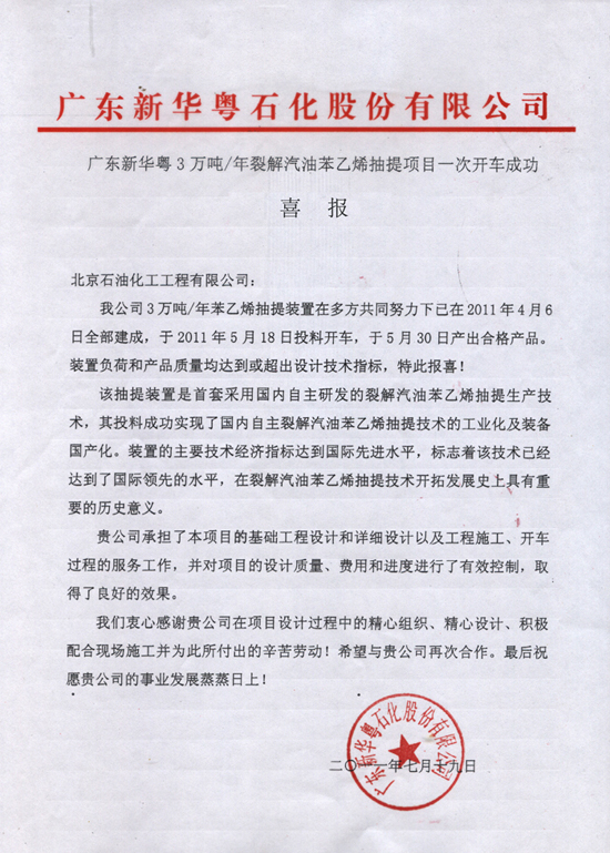 由我公司負責設計的廣東新華粵3萬噸/年裂解汽油苯乙烯抽提項目于2011年5月18日投料開車,并于5月30日產出合格產品。目前,裝置負荷和產品質量均達到或超過設計技術指標。為此,業主單位廣東新華粵石化股份有限公司特向我公司發來喜報。