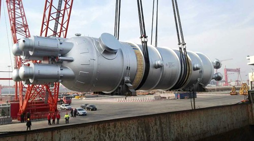 據了解,該設備采用目前世界上最先進的英國davy公司中壓甲醇合成工藝技術,并由韓國Doosan公司制造,凈重347噸、長26米、最大直徑3.7米,單體產能達180萬噸/年。這個“龐然重器”歷經4個多月的時間終于從天津港運抵項目現場。